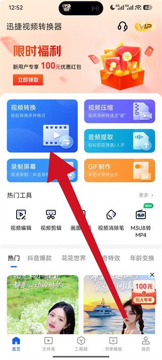 2、在首页功能区找到视频转换并点击,进入视频选择页面。
