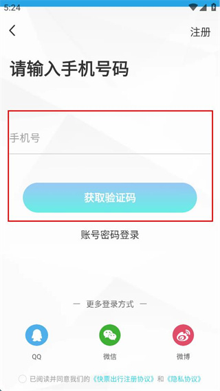4、在登录页面的手机号输入框填写号码,点击获取验证码准备完成登录。