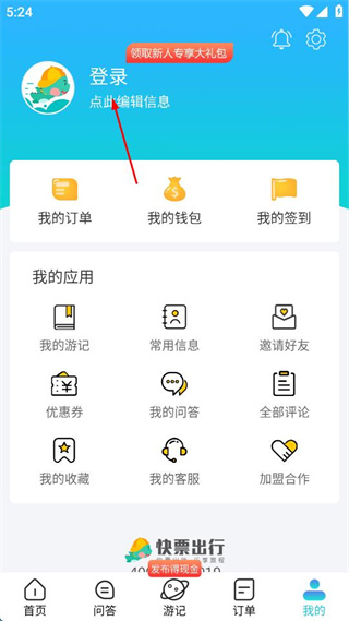 2、进入快票出行主界面,找到右下角的我的选项,点击进入个人中心页面。