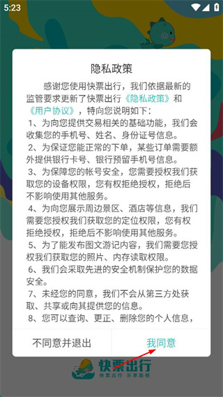 1、打开快票出行页面,查看弹出的隐私政策,点击我同意按钮继续操作。