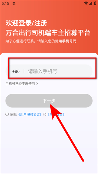 2、在欢迎登录注册页面,输入手机号,点击下一步,进入输入验证码页面。