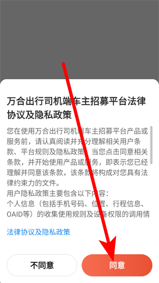 1、在万合出行司机端弹窗中,点击同意,进入后续界面。