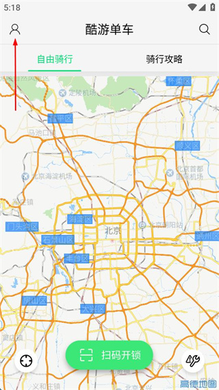 2、进入酷游单车主界面,找到左上角的用户图标,点击进入用户登录页面。