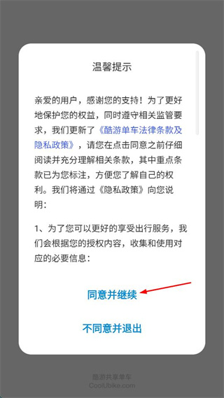 1、打开酷游单车页面,查看弹出的温馨提示,点击同意并继续按钮。