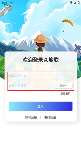 3、进入欢迎登录众旅联界面,找到手机号输入框,在框内输入对应的手机号。