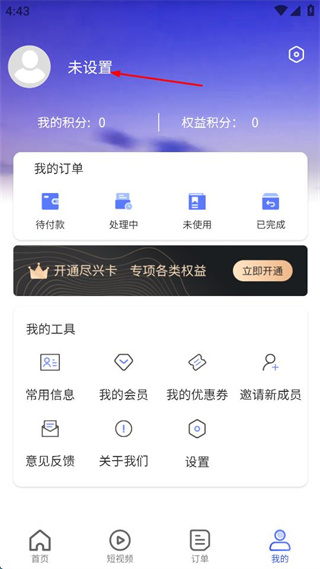 2、在我的页面里,找到未设置区域,点击该区域进入到登录相关的界面。