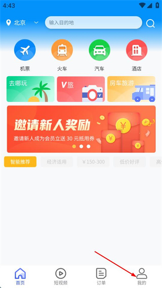 1、打开众旅联软件,进入首页界面,找到底部我的选项,点击该选项进入对应页面。