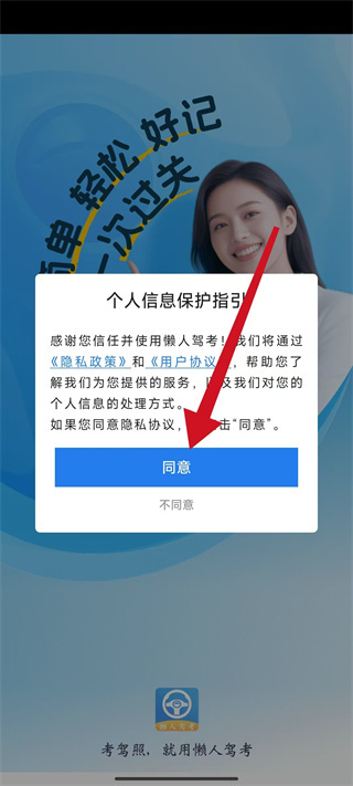 1、打开懒人驾考,进入后在弹出弹窗点击同意,进入应用主页面。