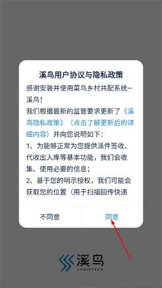 1、在溪鸟用户协议与隐私政策弹窗中,点击同意,进入登录页面。