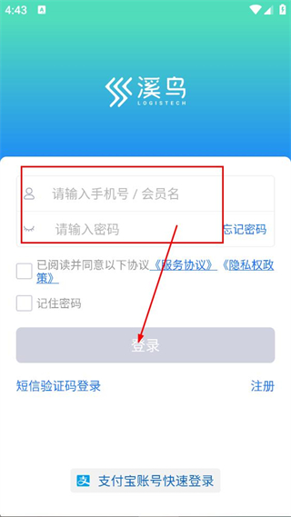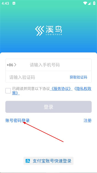 2、在溪鸟登录页面,点击账号密码登录选项,切换至账号密码登录操作界面。