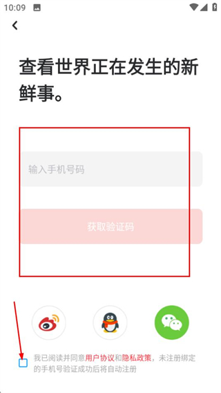 3、在登录注册页面勾选协议后,填写手机号码并点击获取验证码。