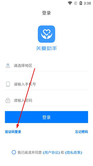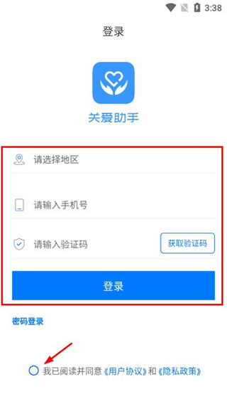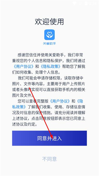 1、打开关爱助手APP,在欢迎页面点击同意并进入,进入登录界面。