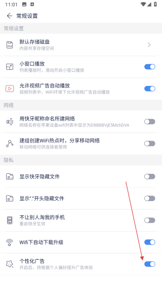 4、在常规设置页面,找到个性化广告功能对应的开关按钮,点击该开关将其关闭。