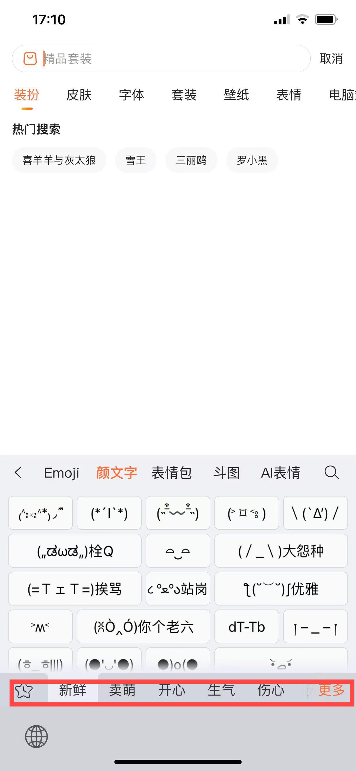 3、在颜文字界面,可通过下方卖萌、开心等分类标签筛选,找到想要的颜文字符号。