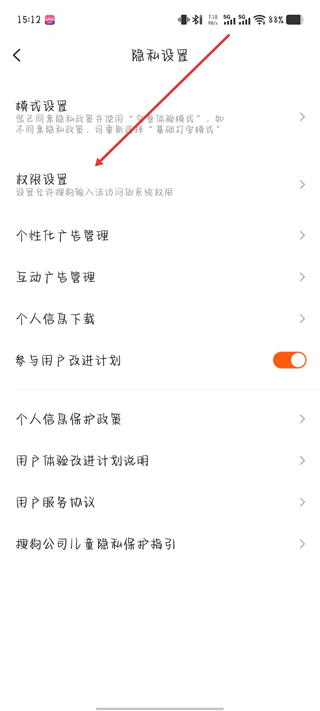 3、在隐私设置页面,点击权限设置选项。