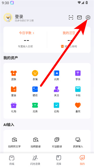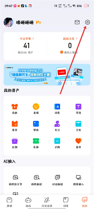 1、在搜狗输入法我的页面,点击右上角设置图标,进入设置页面。