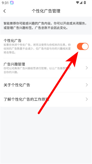 4、在个性化广告管理页面,点击个性化广告开关,即可关闭该功能。