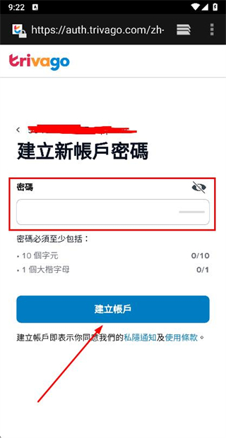 3、在新账户建立页面填写密码后,点击建立账户完成注册操作。