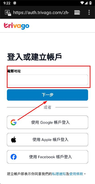 2、在登入或建立账户页面填写邮箱地址,点击下一步进入新账户建立页面。