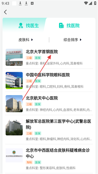 2、进入科室页面后,会显示提供该科室服务的医院列表,选择一家想要就诊的医院。