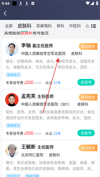 3、进入所选医院的科室医生页面,浏览医生信息,选择一位想要挂号的医生。