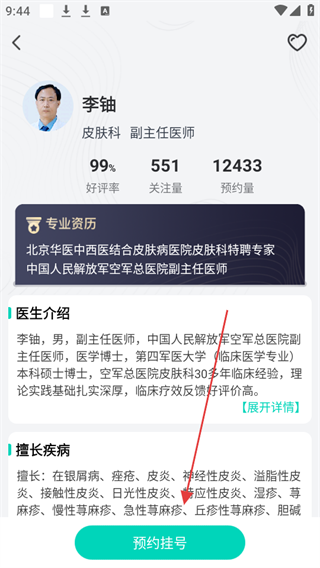 4、进入医生详情页面,查看医生介绍及擅长疾病等信息,点击预约挂号。