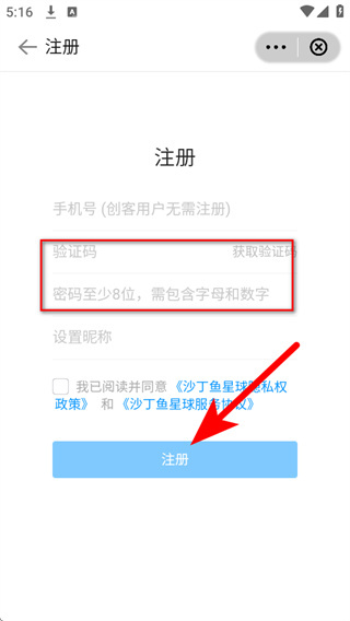 4、在验证码框填写收到的验证码,再设置符合要求的密码,勾选相关协议后,点击注册,即可完成账号注册。