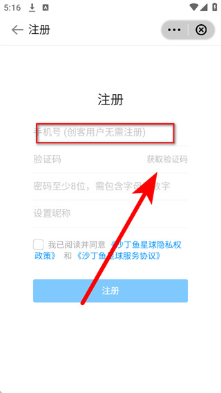 3、在注册页面的手机号输入框中填写自己的手机号码,点击获取验证码按钮获取短信验证码。