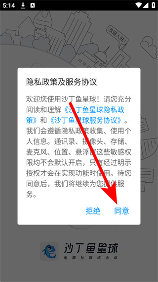 1、打开沙丁鱼星球,进入后会弹出弹窗,再点击弹窗中的同意,进入登录页面。