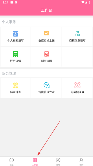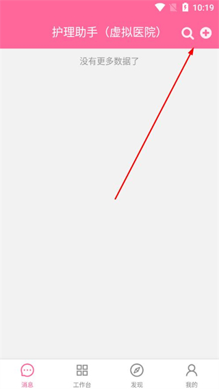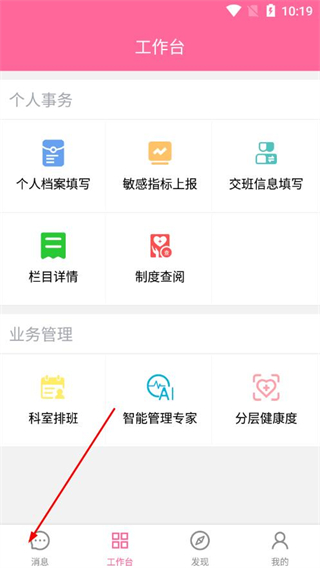 1、打开护理助手应用,在工作台页面点击底部导航栏的消息。