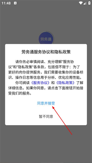 1、在劳务通服务协议和隐私政策弹窗中,点击同意,进入页面。