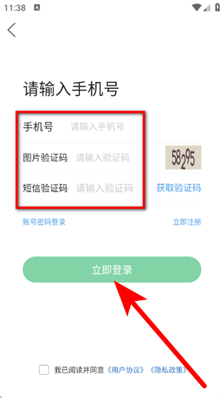 4、在短信验证码登录页面,输入手机号和验证码,点击立即登录,完成登录。