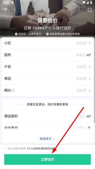 3、在页面填写房源信息,若有赠送面积和装修费用也可填写,点击立即估价。