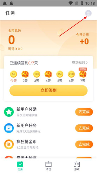 3、进入任务页面后,找到页面右上角的头像图标,点击该图标跳转至登录界面。