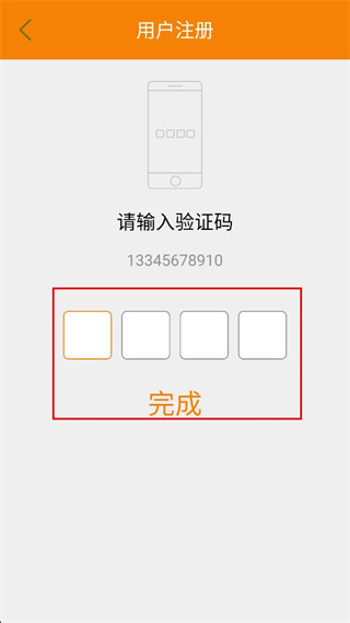 3、跳转至请输入验证码页面,在对应的输入框中填写收到的验证码,点击完成。