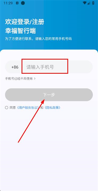2、在登录页面填写手机号,勾选协议后,点击下一步获取验证码。