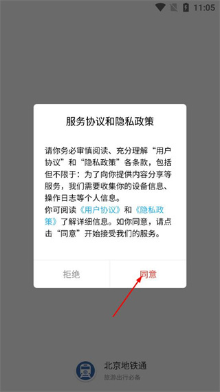 1、打开北京地铁通软件,查看弹出的服务协议和隐私政策,点击同意按钮进入主界面。
