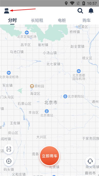 1、打开孙行者共享汽车软件,点击页面左上角的图标,进入账号相关操作页面。