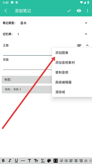 3、在进入到添加笔记页面后,可以点击添加图像选项,为笔记添加正面图像。