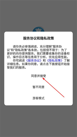 1、在服务协议和隐私政策弹窗中,点击同意并接受,进入服务器选择页面。
