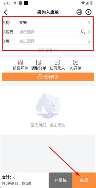 3、在采购入库单页面完善机构、供应商等信息后,点击结算按钮完成采购入库操作。