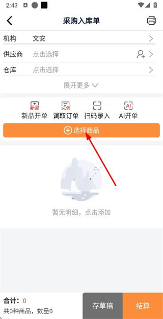 2、在采购入库单页面点击选择商品按钮,开始添加采购商品。