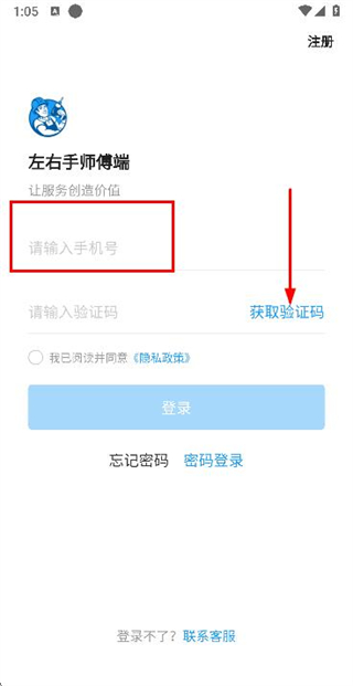 2、在登录页面填写手机号,勾选协议后,点击获取验证码。