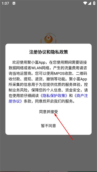 1、在注册协议和隐私政策弹窗中,点击同意并接受,进入登录页面。