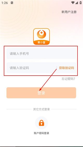 3、在手机验证码登录界面,填写手机号,获取并填写验证码,点击登录,完成账号登录。