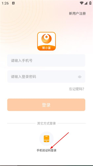 2、在登录页面,点击手机验证码登录选项,切换至验证码登录的信息填写界面。