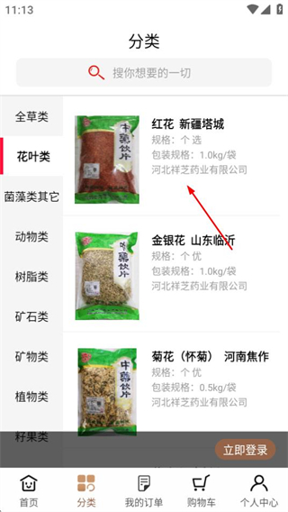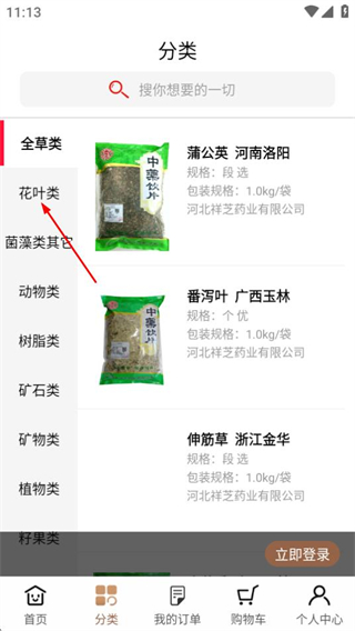 2、在分类页面点击花叶类选项,查看对应品类的药材。