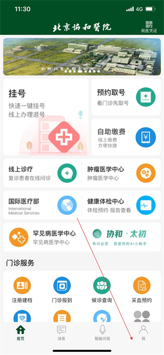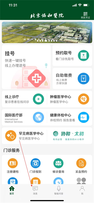 1、打开北京协和医院APP首页,点击底部导航栏的消息选项。