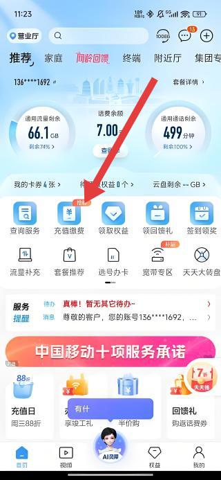 1、打开中国移动APP首页,点击充值缴费图标,进入话费充值页面,可选择固定金额或自定义充值方式。