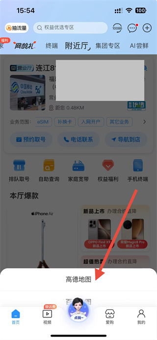 3、在弹出的应用选择界面中,选择高德地图或其他地图应用,即可跳转至地图应用开始导航到该营业厅。